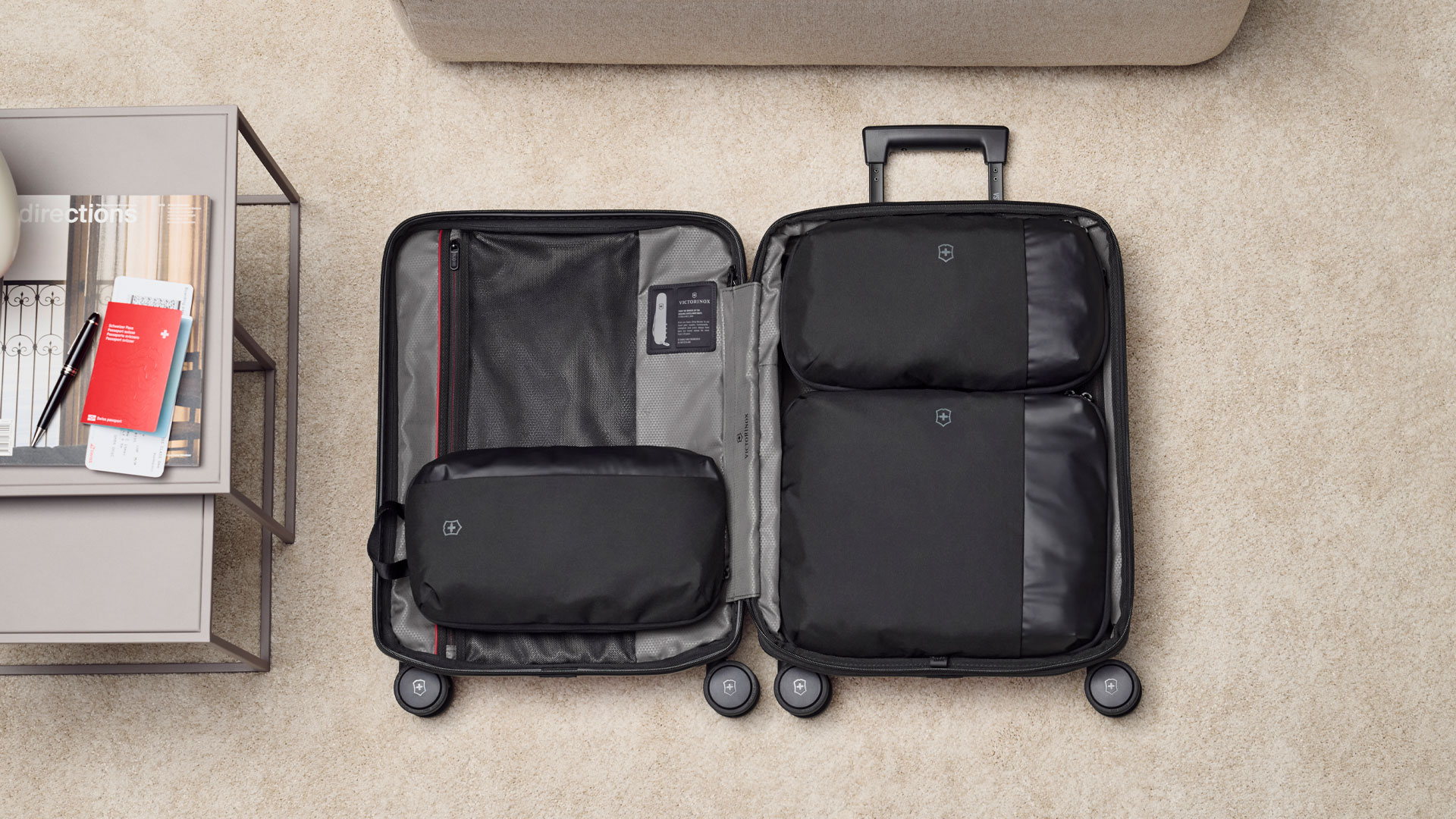 Ya sea un bolso compacto o uno con gancho para colgar, Victorinox ofrece soluciones para organizar sus artículos de tocador con compartimentos resistentes a derrames y recubrimiento antimicrobiano, pensadas para viajes cortos.